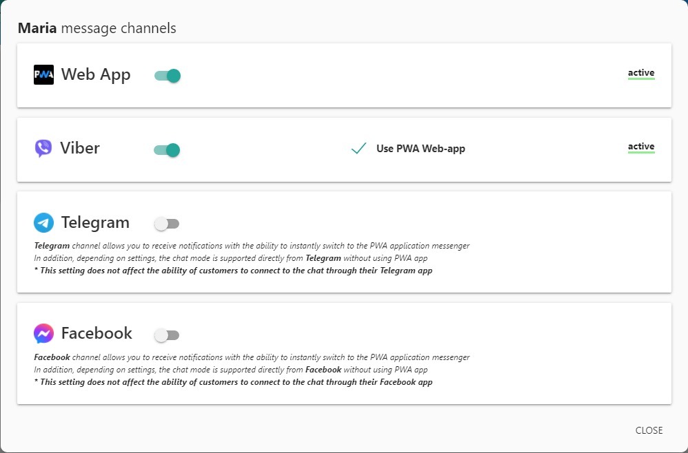 Windows devices: Push Notification only come when a web browser is running, but regardless of whether PVA is launched or our site is open in a browser. Make sure that notifications are allowed for our site and/or installed PWA If only Windows device is used to receive Push Notifications, it is recommended to additionally connect the channel through any of the messengers (Viber, Telegram, Facebook Messenger). Install the corresponding messenger application on the same Windows device. In this case, notifications will come through the messenger and will not be lost if the browser is not running. When you click on the received notification in the messenger, our PWA will be launched and the corresponding chat is open in Team Messenger