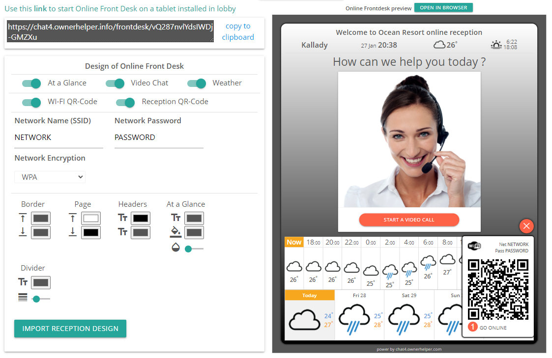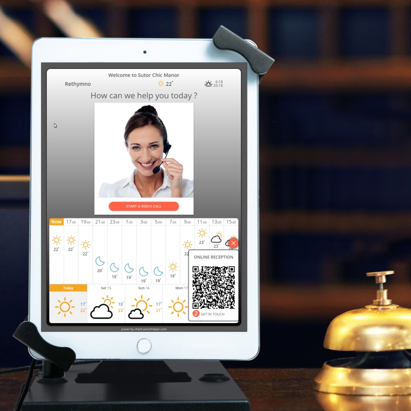 Remote Front Desk allows your guests to communicate remotely with audio and video with your staff through a tablet installed in the lobby of your hotel Additionally, the tablet with Remote Front Desk in the idle mode can display the local weather forecast and QR-codes for connecting guest phones to hotel Wi-Fi and Online Reception