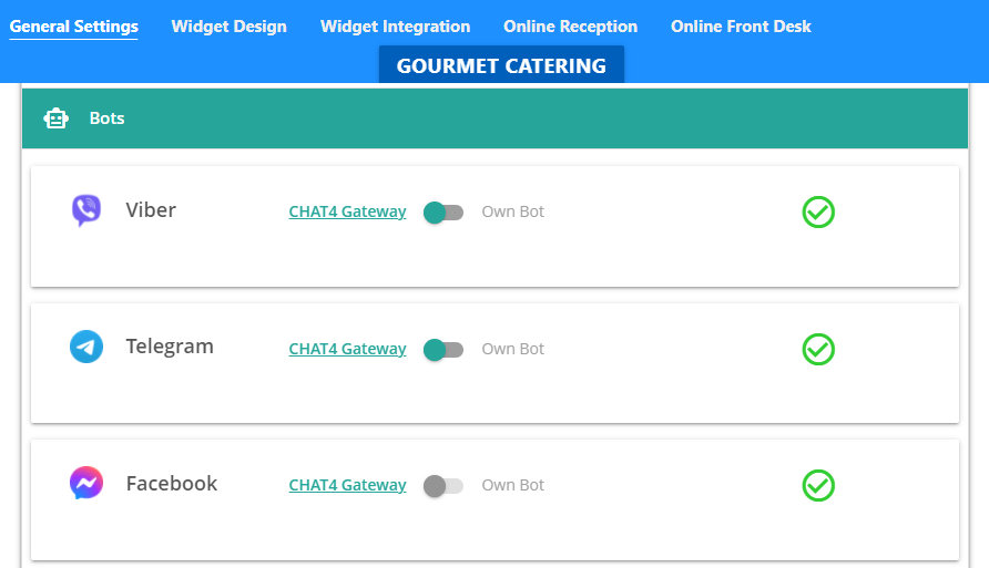 To use your bot instead of our universal gateway, use the token that you will receive after creating the bot on the corresponding platform You don't need to configure or code anything other than creating a bot. Our system will use its own code to provide a connection of customers through your bot