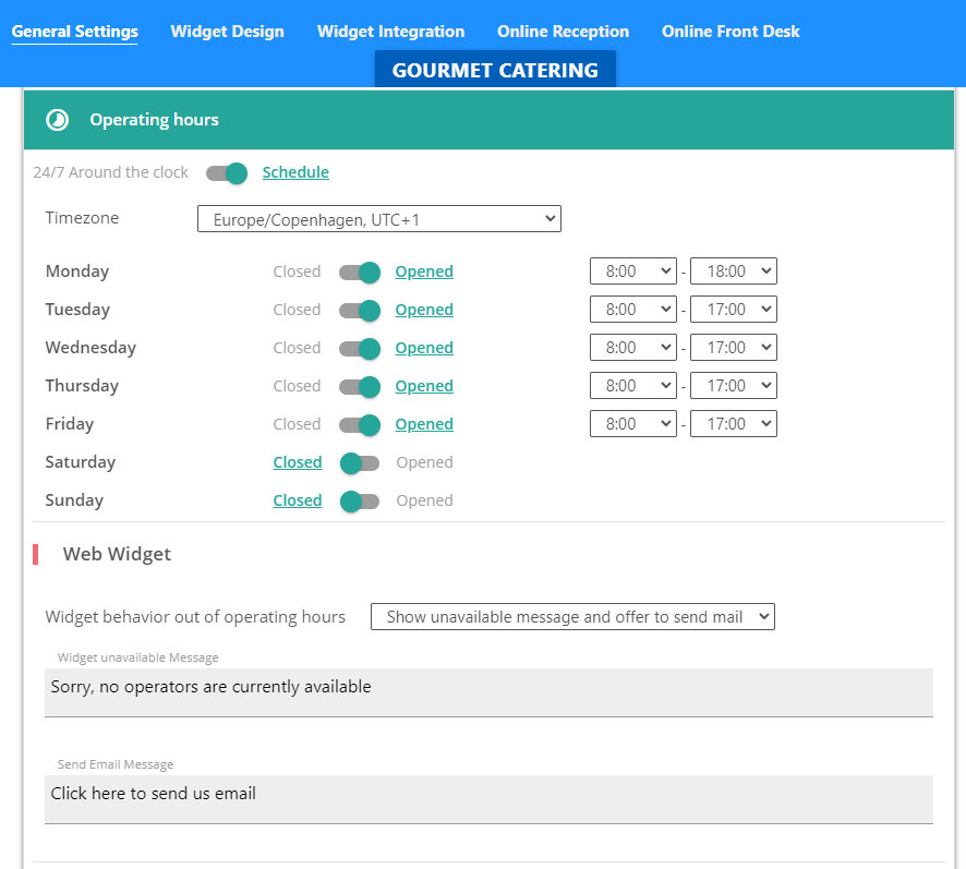 Your team's schedule Allows you to configure working hours when your team agents can respond to chat messages and non-working hours when the customers receives an appropriate notification and an offer to send an email (depending on settings) For this feature to work correctly, make sure the timezone is set correctly to match the actual location of your team staff.