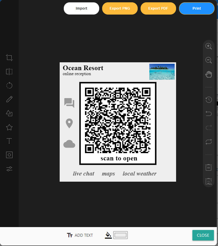 The QR-code Editor allows you to prepare the design of your stickers and plates for self-printing You can add any text, logo, change colors, etc. Then you can export to PNG and PDF or print the sticker on your printer