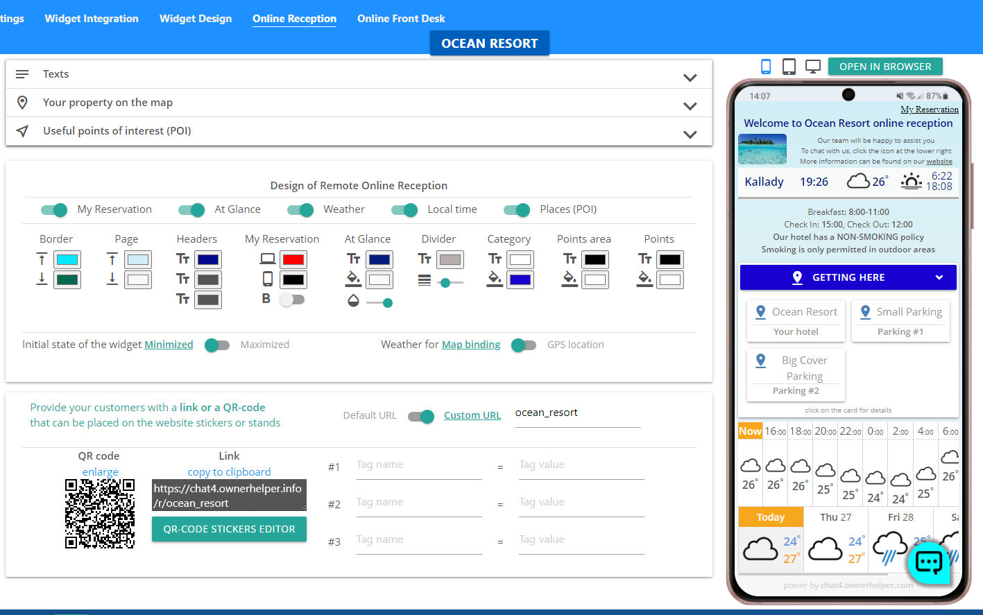 By default the Online Reception link looks like "https://smart4.ownerhelper.com/reception/M-EGeV9o2tH4jgHGa19hU" With the "Custom URL" you can get the link more simple and readable like "https://smart4.ownerhelper.com/reception/r/ocean_resort" Note: This setting changes the QR-code