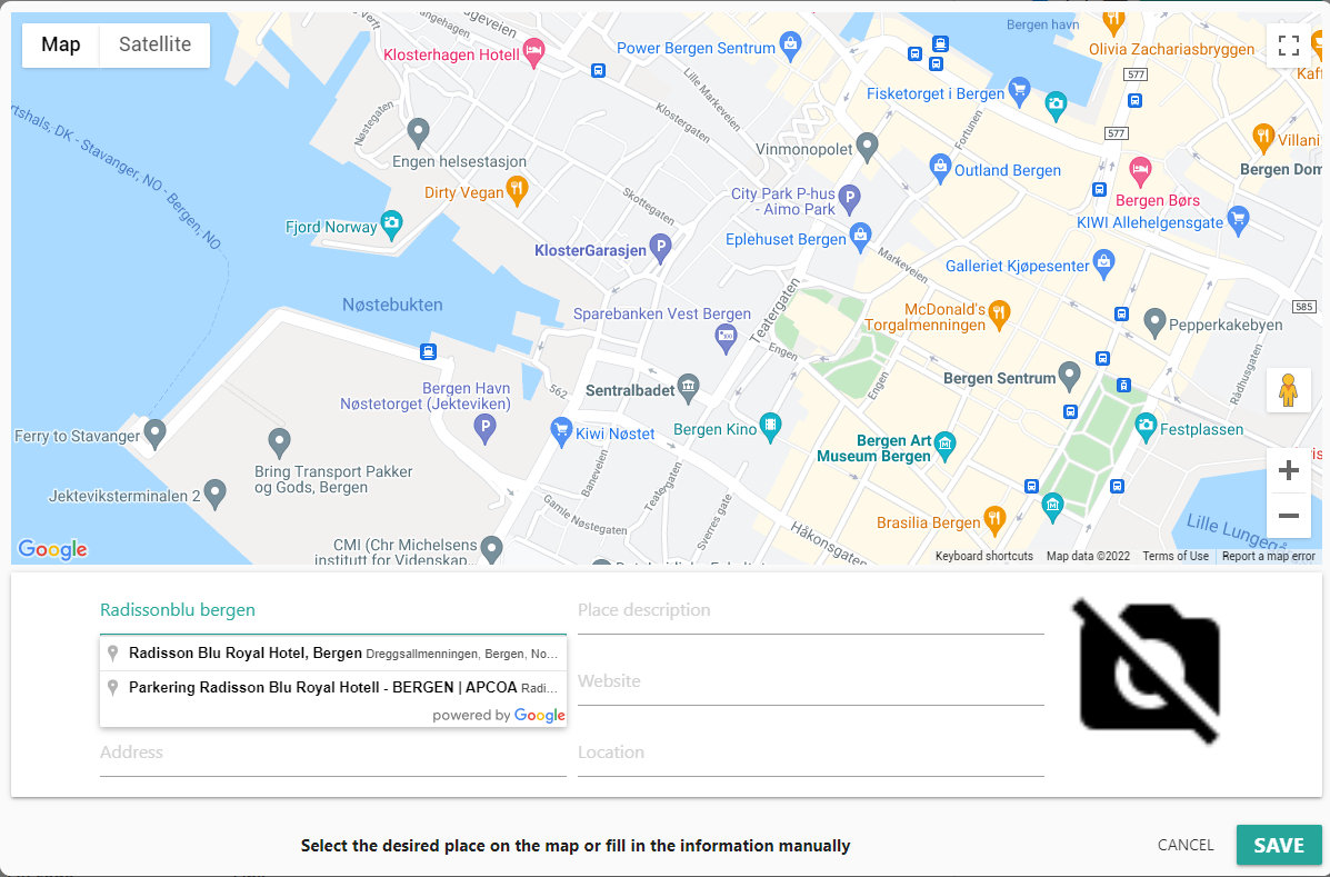 Specify the exact location of your object (hotel, villas, office, etc.) on the map. This will allow our service to determine your timezone, weather, etc.