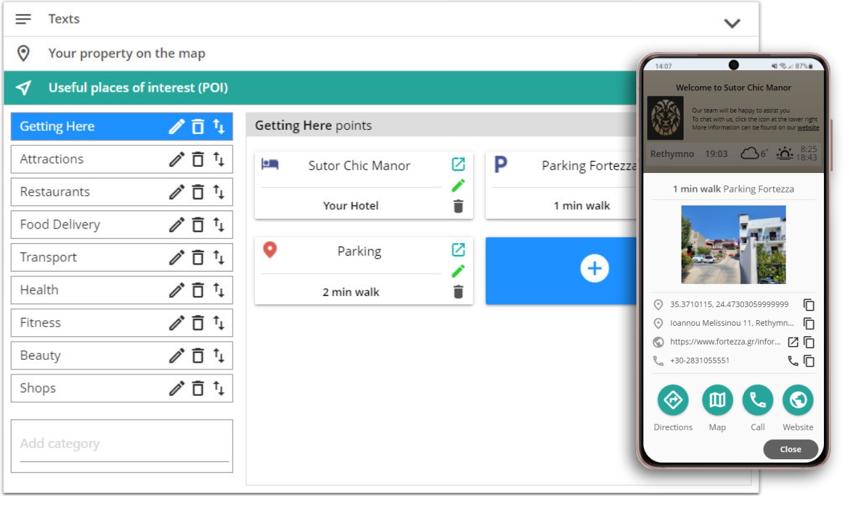 For accommodation facilities, this is a great opportunity to provide guests with accurate details about how to drive/walk to the object where the nearest parking is located, etc.Also, guests will be grateful for information on taxi and transfer services, about the best restaurants, spa, fitness centers and shops in the district.