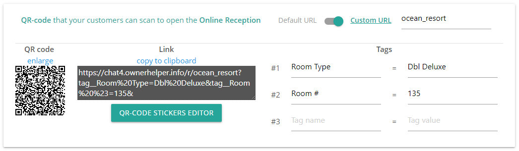 Tags allow you to add unique tags for different QR-codes. It allows the agent in the Team Messenger to determine from which room/villa/car/etc the Online Reception was opened Note: These settings make changes to the QR-code and link.