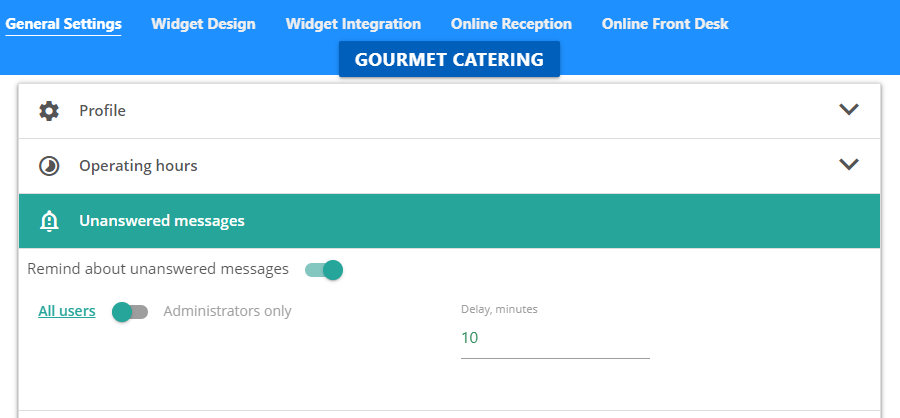 If the customer has not been answered within a certain period of time, our service can send a notification of an unanswered message to your team members. In this section you can configure how this feature should work.
