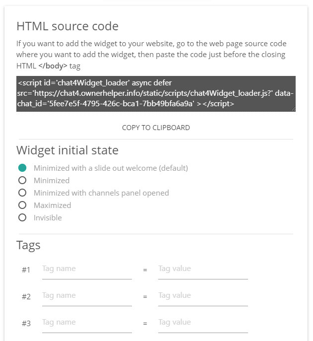 Tags: Allows you to add unique tags for different pages of your site. Tags allow to determine from which page of the website the chat widget was opened