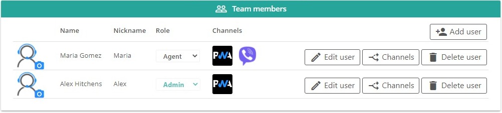 ' The Channels button allows to configure the Channels through which the team member will receive notifications of new messages. The Delete user button allows to delete User from the Project